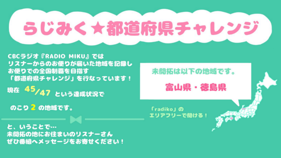 ![]() いよいよあと2県!らじみく★都道府県チャレンジ継続中! 『RADIO MIKU』では、各都道府県からの投稿により全国制覇を目指しています。