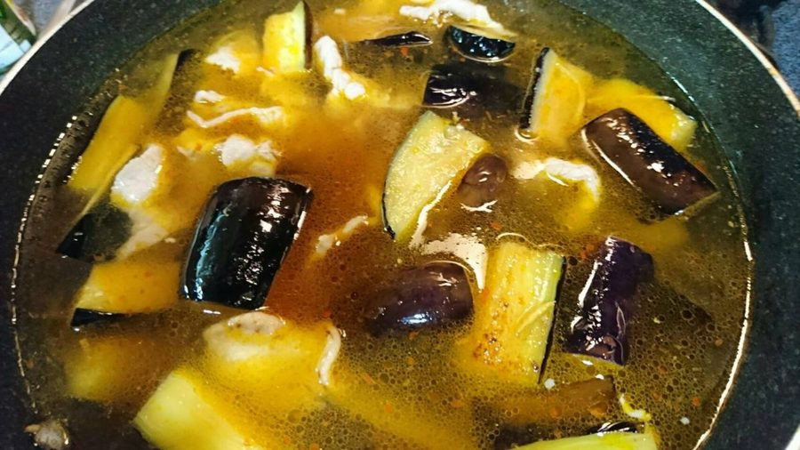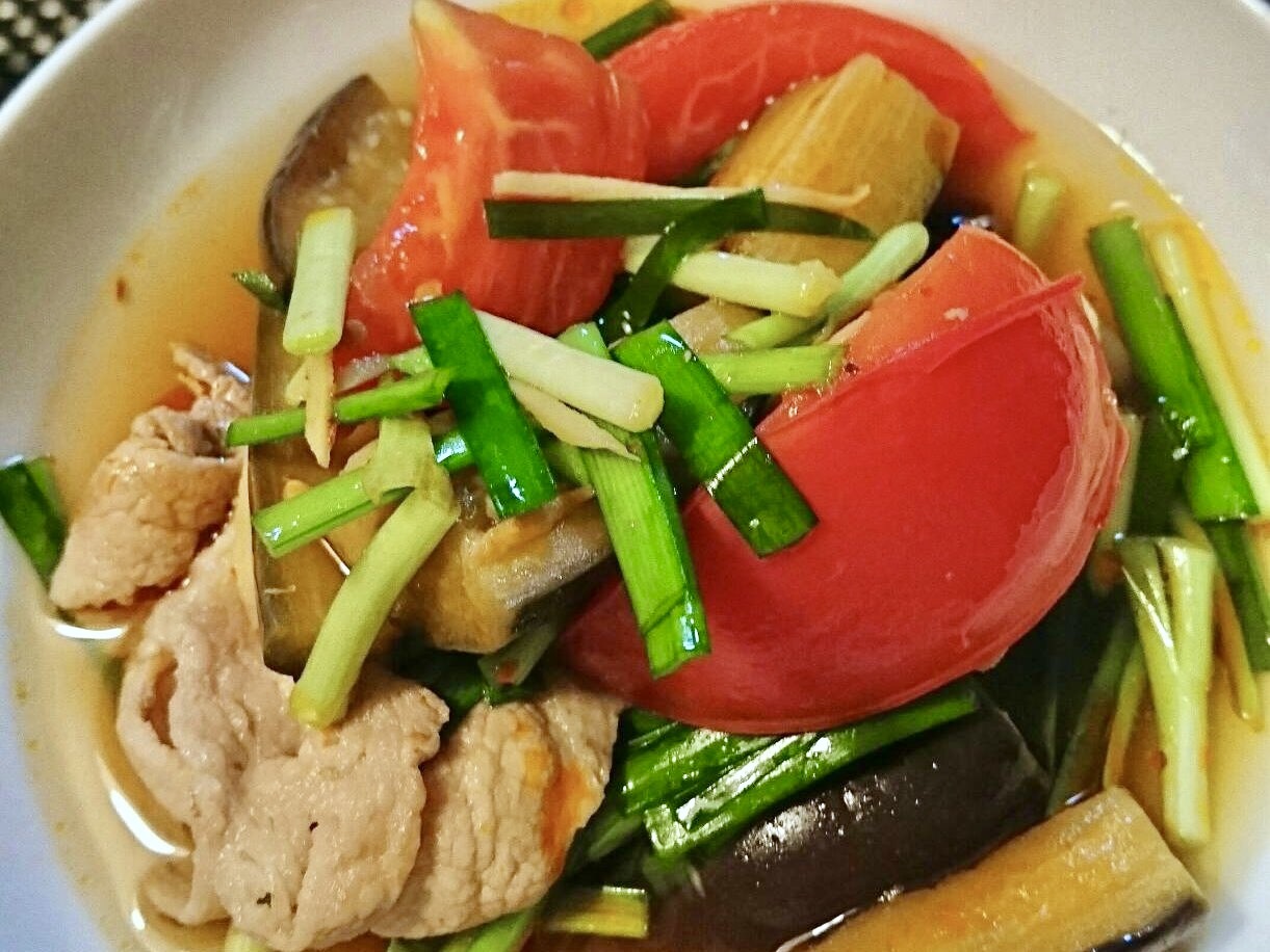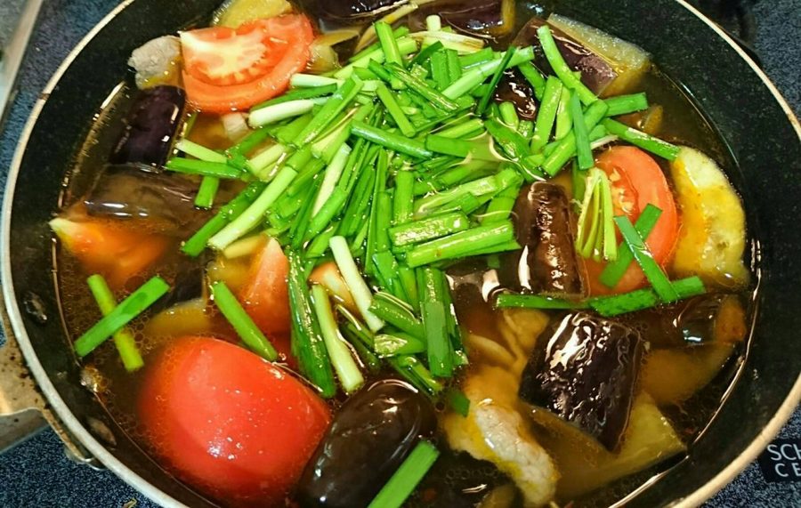 どんなお料理かと申しますと、酸味が効いたピリ辛スープです。旬の秋茄子、そして夏の名残のトマトをたっぷり使った、夏バテ解消にもぴったりの料理です。