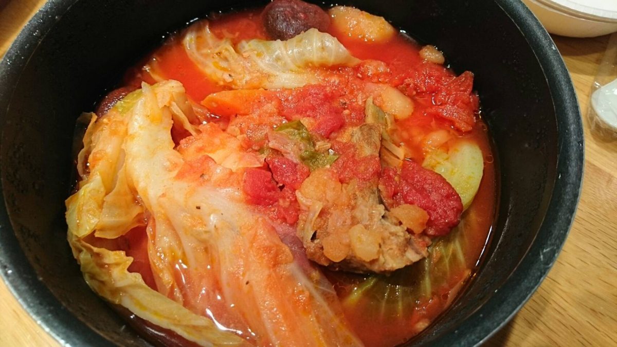 ⑤スペアリブが柔らかくなったところで、鍋にジャガイモとキャベツを入れて煮込む。ジャガイモが5割ほどやわらかくなったら、炒めたニンジン・ビーツを入れる。そこにつぶしたトマトの水煮を汁ごと、さらに残したビーツの汁を加える。ビーツが柔らかくなったら塩・胡椒で味を調える。