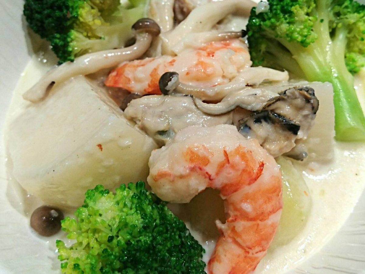 ⑦牛乳を加え、シメジと牡蠣・海老を蒸し汁ごと入れ、コクをつけるための生クリーム、塩・胡椒で味を調える。