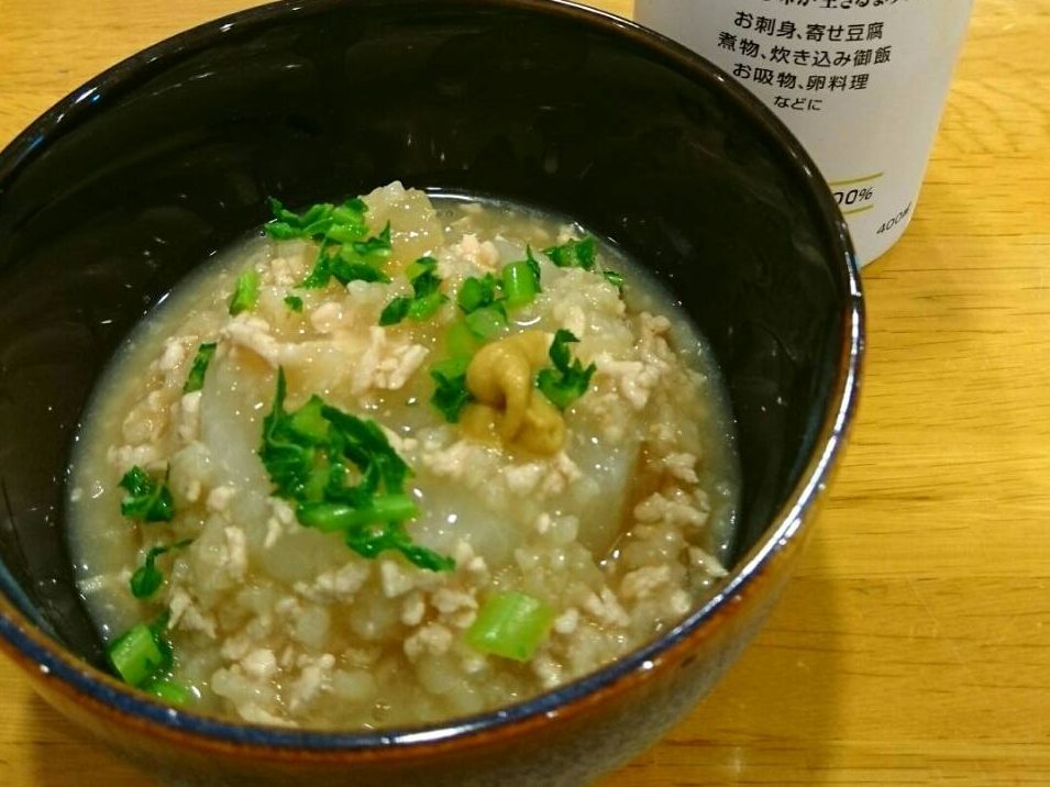 ③茹だった大根を器にとり、出汁昆布も取り出す。残った米と煮汁の中に鶏むねの挽き肉を入れる。箸で捌きながら米粒と一緒に沸騰させる。