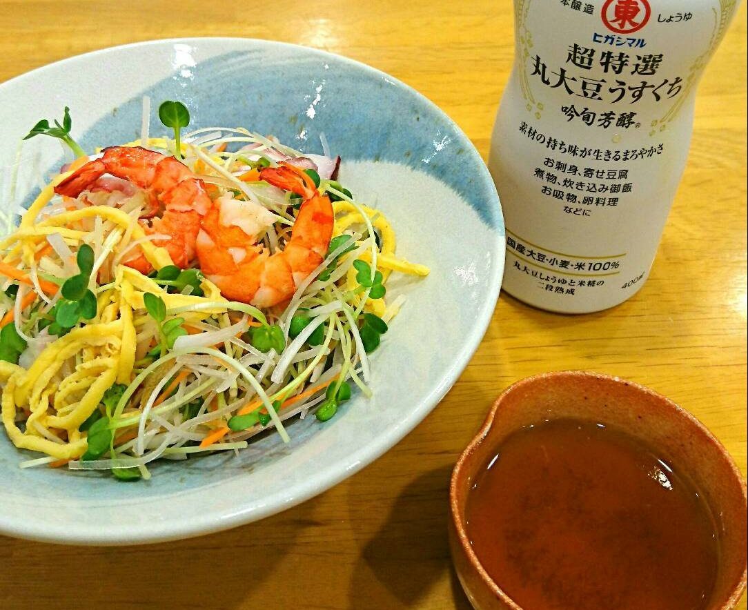 サラダには野菜だけでなく、エビやタコ、玉子なんかも乗せるとおいしくなります。