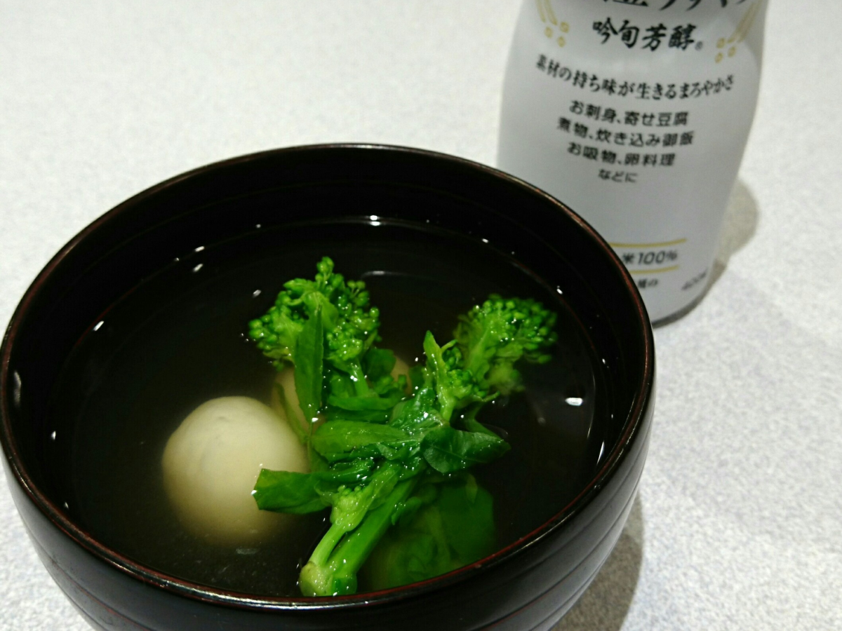 ④おろし間際に団子を入れ、少し温める。お椀に団子と汁を入れ、茹でた菜ばなや菜の花を添える。お好みで木の芽を添えて完成!!