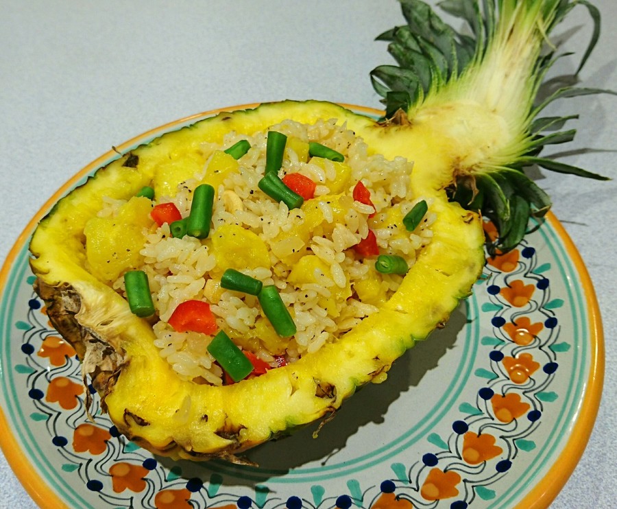 ①パイナップルはきれいに洗い、水気をふき縦に半分に切る。