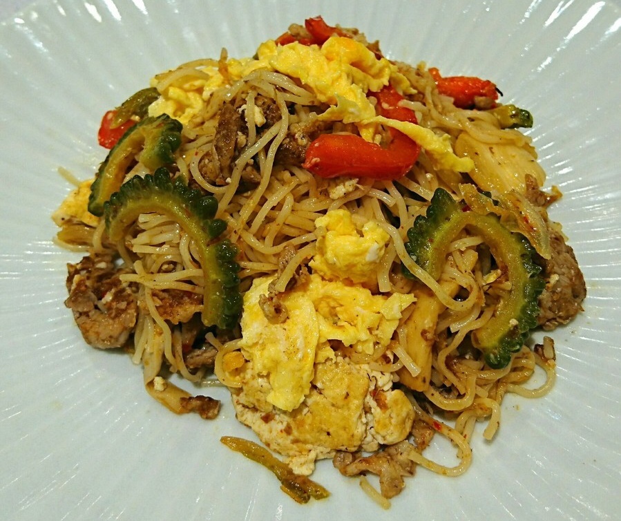 そうめんが入っているから主食としても食べられるし、ゴーヤチャンプルとしておかずとしても食べられる。
