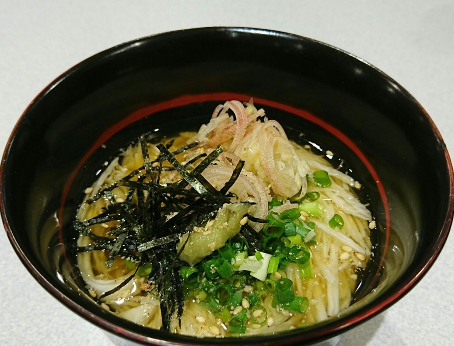 器の中のおつゆに沈む、真っ白な細い線。薬味も浮いて、見た目は完全なるそうめんです。