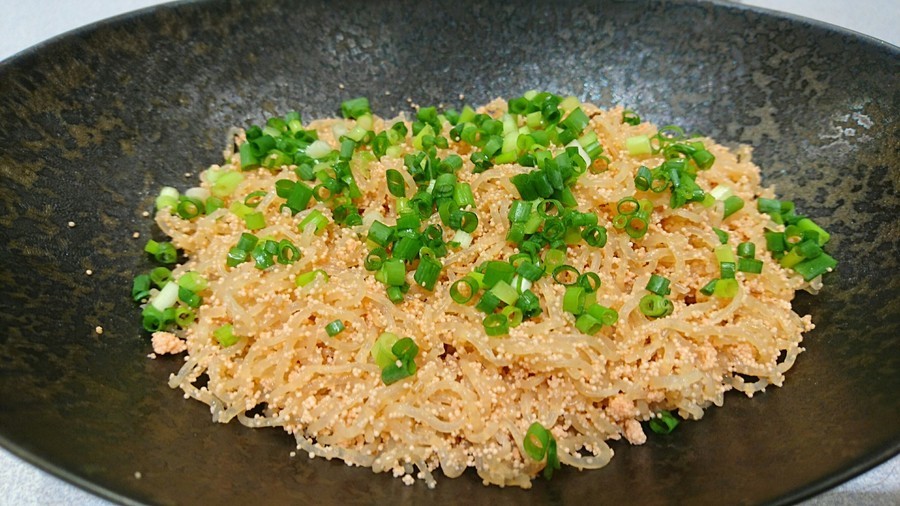 しらたきの白がタラコのピンクに満遍なく染まっています。