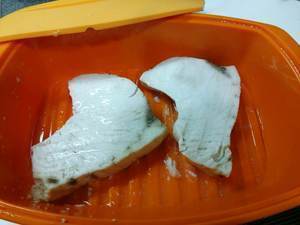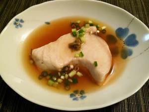 ① 切り身の白身魚(なんでも。今回は扱いやすいからメカジキにしました)を、 耐熱容器にいれ、電子レンジで3分。様子を見て中まで火が通るまで 追加しながらチンします。