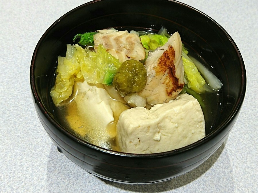 お椀の中に美しく、白菜、白身魚、お豆腐、きのこ。そして上に柚子胡椒。
